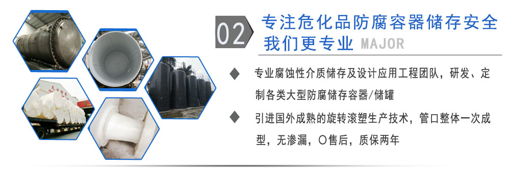 公司有鋼襯塑PE/PO、PE全塑、碳鋼、不銹鋼四大系列100多個品種,專注于常壓儲存容器生產,其產品包括鋼襯塑儲罐管口一體成型PE儲罐、碳鋼儲罐不銹鋼儲罐、反應釜、攪拌罐、離子交換柱、鋼襯PE/PO儲罐、塑料儲罐鹽酸儲罐、硫酸儲罐等等。更大限度滿足廣大客戶的各種需求,同時可以根據客戶的需要加工定制各種防腐設備。